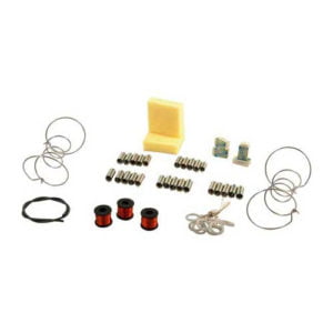 The kit comprises 2 wide steel springs of 4 turns 50 mm dia, 25, expandable steel springs with ends bent to form hooks, foam blocks 130 x 50 x 50 mm, one 50 gms reel of 32.S.W.G. copper wire, two 50 gms reels of 26 SWG bare copper wire, one meter length of latex rubber tubing, 4 elastic cords with eyelets and 4 soft erasures for twisting.SKU: n/a - Mechanics Physics Labware