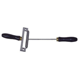 Comprising a mild steel bar 110 x 10 mm. length x diameter, on rod with wood handle, overall length approx. 280 mm. with metal cast gauge, sliding fit over ends of bar and with hole 10 mm. bore in one Arm.