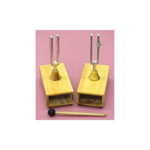 Four tuning forks are mounted on a single proper sized resonance box to produce a major chord. Forks have frequencies of C1 256, E 320 Hz, G 384 Hz and C2 512 Hz. When struck together with hammer, the forks will produce the chord of C major, supplied with one hammer.