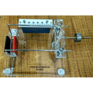 Force on a conductor balance – It is used to demonstrate that when a current is passed through a conductor in a magnetic field, it is subjected to a force of attraction or repulsion depending upon the direction of current in it. It consists of a plastic base 160 x 140mm on which two contact pillars are mounted. Each pillar is provided with an external circuit. A balance beam is supported by the pillars on two bearings, which form the fulcrum. Two screwed masses are provided in the beam system, one moving vertically for the adjustment of sensitivity and the other moving horizontally for the adjustment of the equilibrium position, when no current is flowing. Scale marked 0 to 75 x 1mm, rider of 1 gm weight.